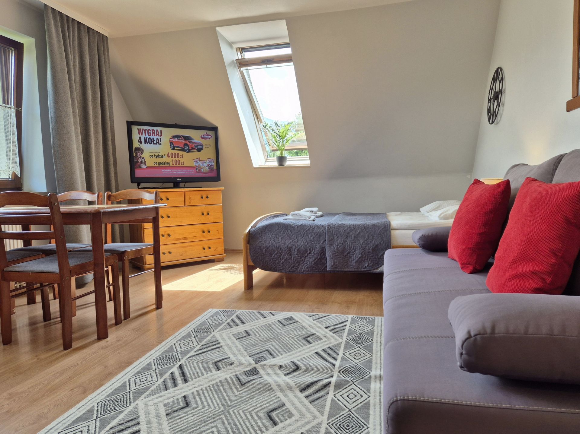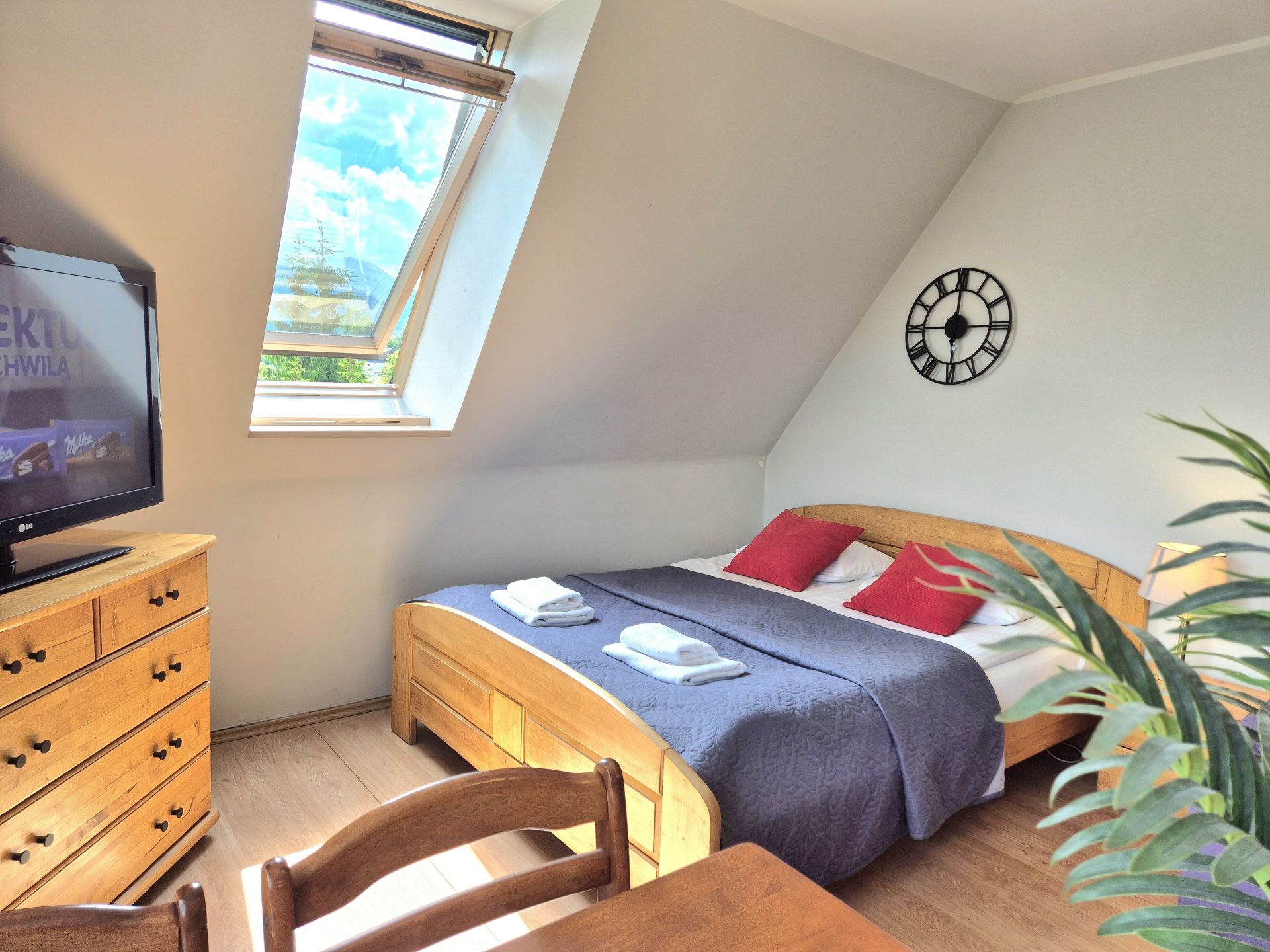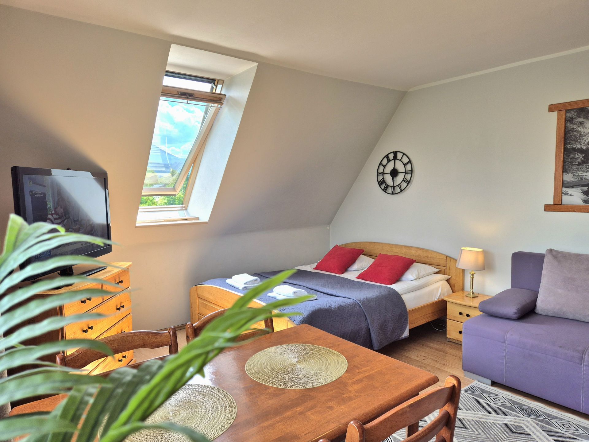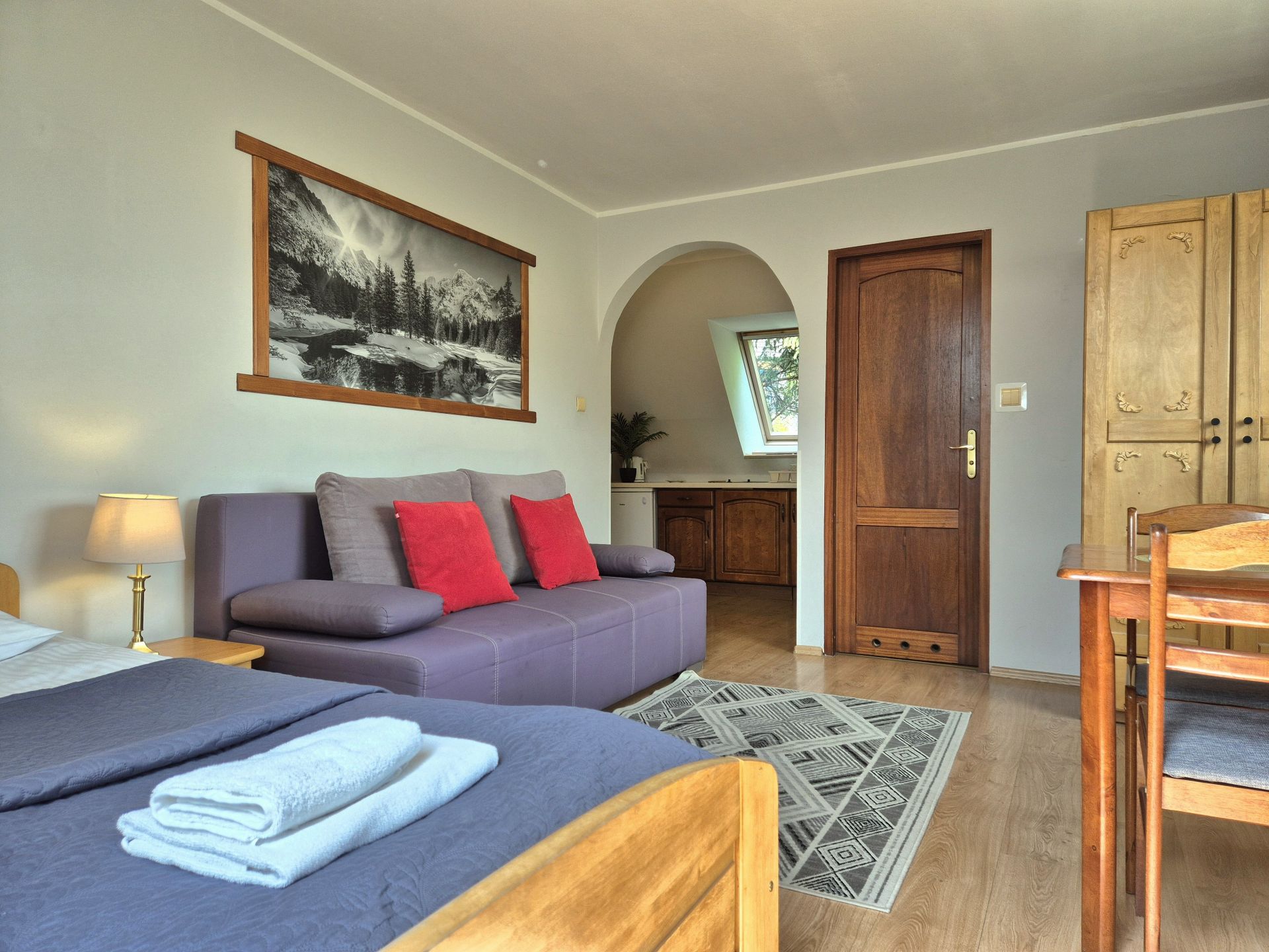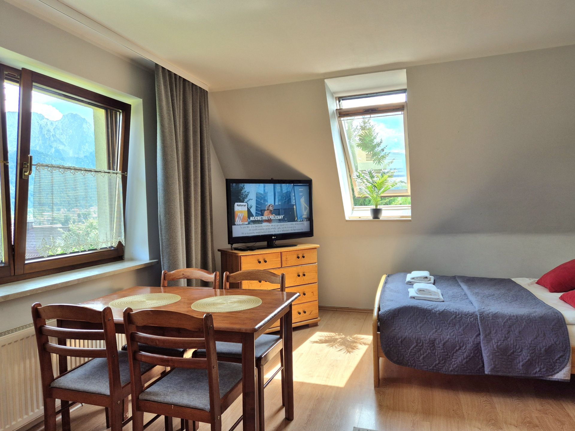 STUDIO to wygodny APARTAMENT składający się z przestronnego pokoju z aneksem kuchennym oraz łazienki. Jest to idealne rozwiązanie dla pary lub małżeństwa z dziećmi, dla których istotna jest możliwość samodzielnego przygotowywania posiłków. W apartamentach znajdują się m.in. łóżko małżeńskie, rozkładana sofa wypoczynkowa, telewizor LCD. Aneksy kuchenne wyposażone są w płytę ceramiczną, lodówkę, czajnik elektryczny, komplet garnków, naczyń, talerzy i sztućców. W łazienkach jest prysznic lub wanna, suszarka i ręczniki. Z każdego apartamentu podziwiać można przepiękną panoramę Tatr. W cenie pobytu wliczony jest bezprzewodowy internet, parking oraz korzystanie z sauny na podczerwień. W okresie letnim funkcjonuje również mini plac zabaw, a na widokowym tarasie istnieje możliwość grillowania. Apartamenty zlokalizowane są w kameralnej Willi VELVET w Kościelisku – tylko 500 metrów od Zakopanego. Do rozrywkowych Krupówek dzieli Państwa jedynie półgodzinny spacer lub pięciominutowa trasa samochodem. W odległości 800 metrów od apartamentów znajduje się Polana Szymoszkowa – znana stacja narciarska z nowoczesnym wyciągiem krzesełkowym na szczyt Gubałówki, otwartym zarówno w zimie, jak i w lecie. Na Polanie w okresie letnim funkcjonuje kąpielisko geotermalne. Najbliższy, a także najnowszy na Podhalu kompleks termalny znajduje się w Chochołowie – tylko 15 minut jazdy samochodem